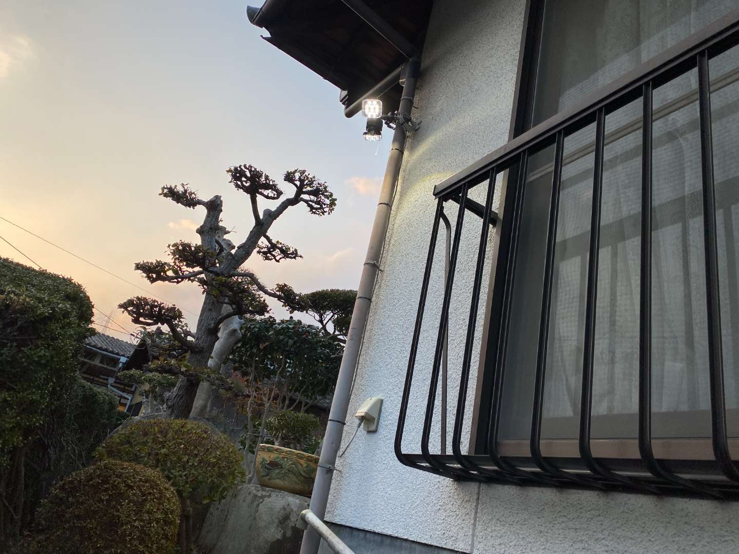 階段が家の角をまわるようになっているため、コーナーに設置をしました。センサーと雨樋いの兼ね合いで下駄をはかせて取付し、階段全体を照らすように工夫しました。